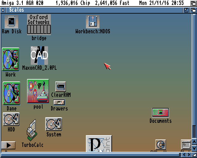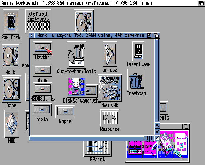 Powskakiwały powyciągane ikonki, widać dyski Work i Dane. Na dyskach są pliki, wszystko z grubsza działa. Niestety Workbench ciągle jest NDOS, nie ma sekwencji startowej i nie ma polskich znaków i klawiatury. I wcale nie pamiętam jak te polskie znaki zrobić 🙂