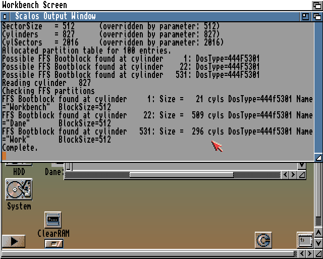 Partycja Work i Dane dają się założyć bez problemu. Gorzej z Workbench – wg RDBrecov powinna się zaczynać od cylindra 1, a HDToolBox nie pozwala ustawić początkowego cylindra mniejszego od 2. Zostawiam więc 2 i zobaczymy. Ok, Save Changes to Drive, Exit i Continue. Amiga się uruchamia od nowa i proszę: