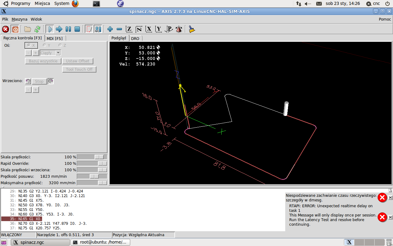 Wybrałem LinuxCNC jako postprocesor, wygenerowałem gcoda.
