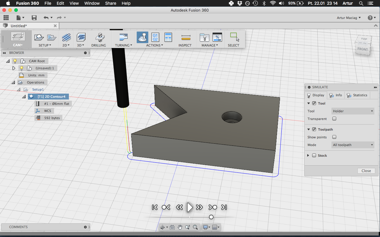 2D -> 2D contour, wybrałem kształt, wybrałem freza. Jest ścieżka 😀