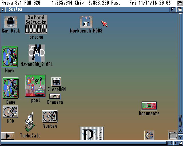 Powskakiwały powyciągane ikonki, widać dyski Work i Dane. Na dyskach są pliki, wszystko z grubsza działa. Niestety Workbench ciągle jest NDOS, nie ma sekwencji startowej i nie ma polskich znaków i klawiatury. I wcale nie pamiętam jak te polskie znaki zrobić 🙂