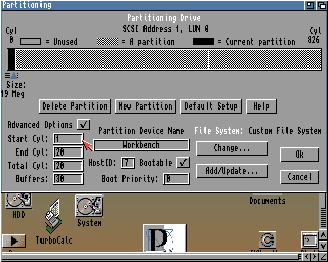 Partycja Work i Dane dają się założyć bez problemu. Gorzej z Workbench – wg RDBrecov powinna się zaczynać od cylindra 1, a HDToolBox nie pozwala ustawić początkowego cylindra mniejszego od 2. Zostawiam więc 2 i zobaczymy. Ok, Save Changes to Drive, Exit i Continue. Amiga się uruchamia od nowa i proszę: