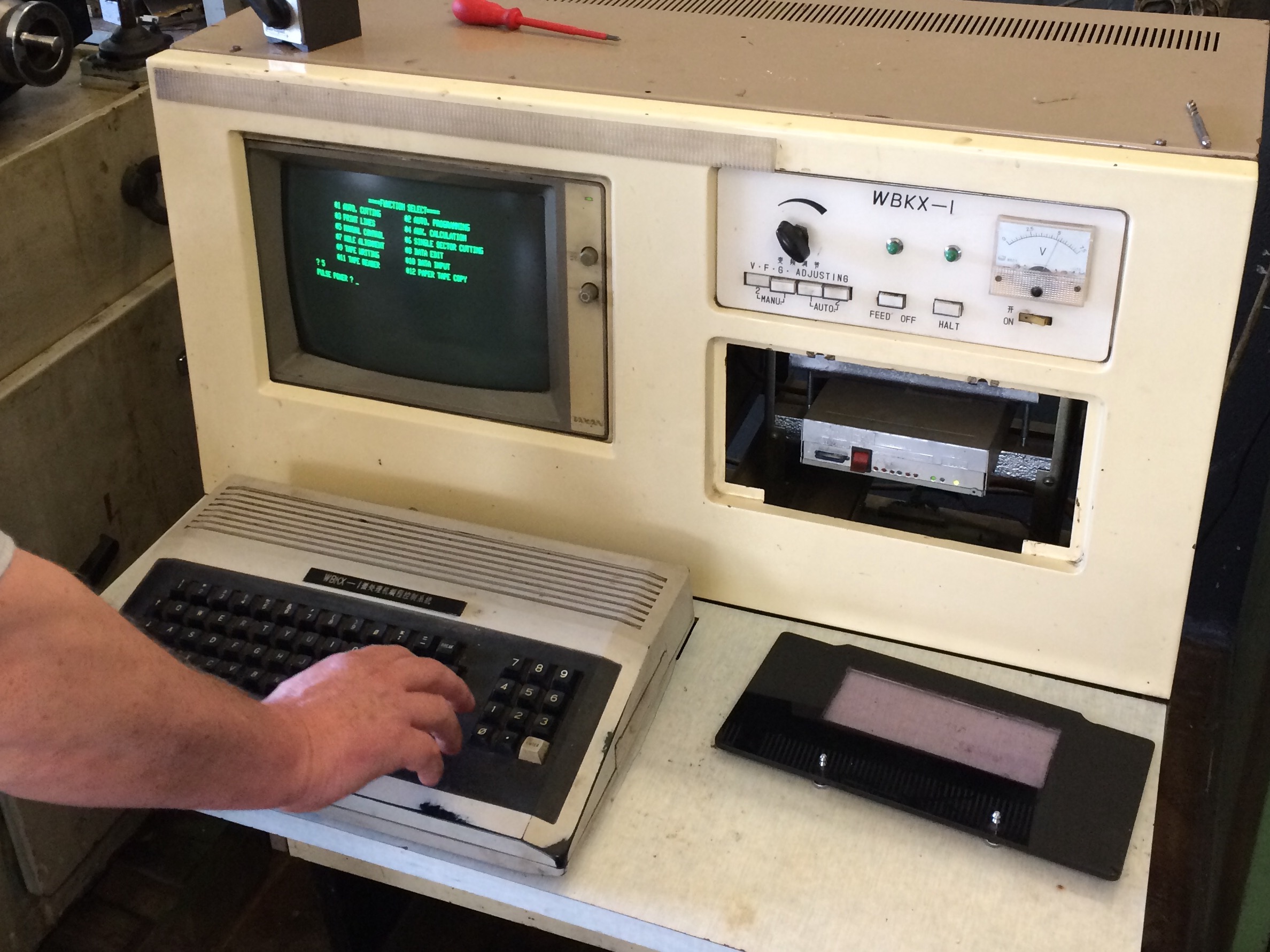 Komputer sterujący to TRS-80 z programem w BASICu. Programy cięcia pierwotnie były podobno na taśmach papierowych, nasza wersja ma już full-wypas-malina czytnik kart SD 😀